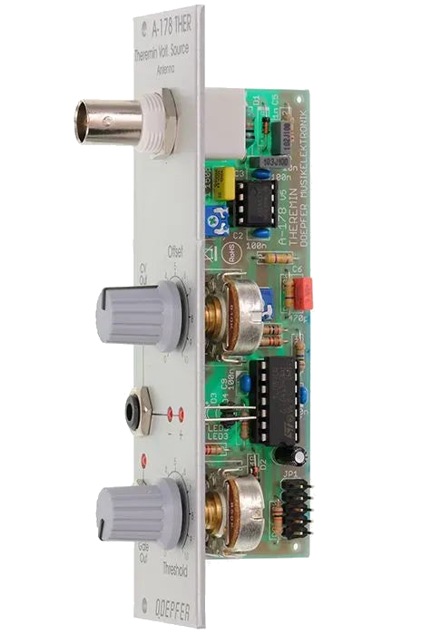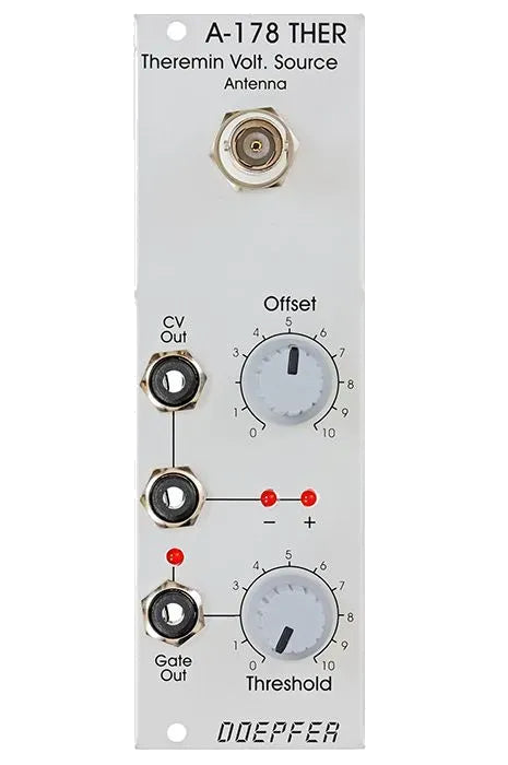The Doepfer A-178 is a theremin-style control voltage source for Eurorack systems. It generates a variable CV depending on your hand’s distance from the antenna—perfect for adding expressive, gestural modulation. A dedicated gate output is also available, triggered when the control voltage crosses a user-defined threshold.