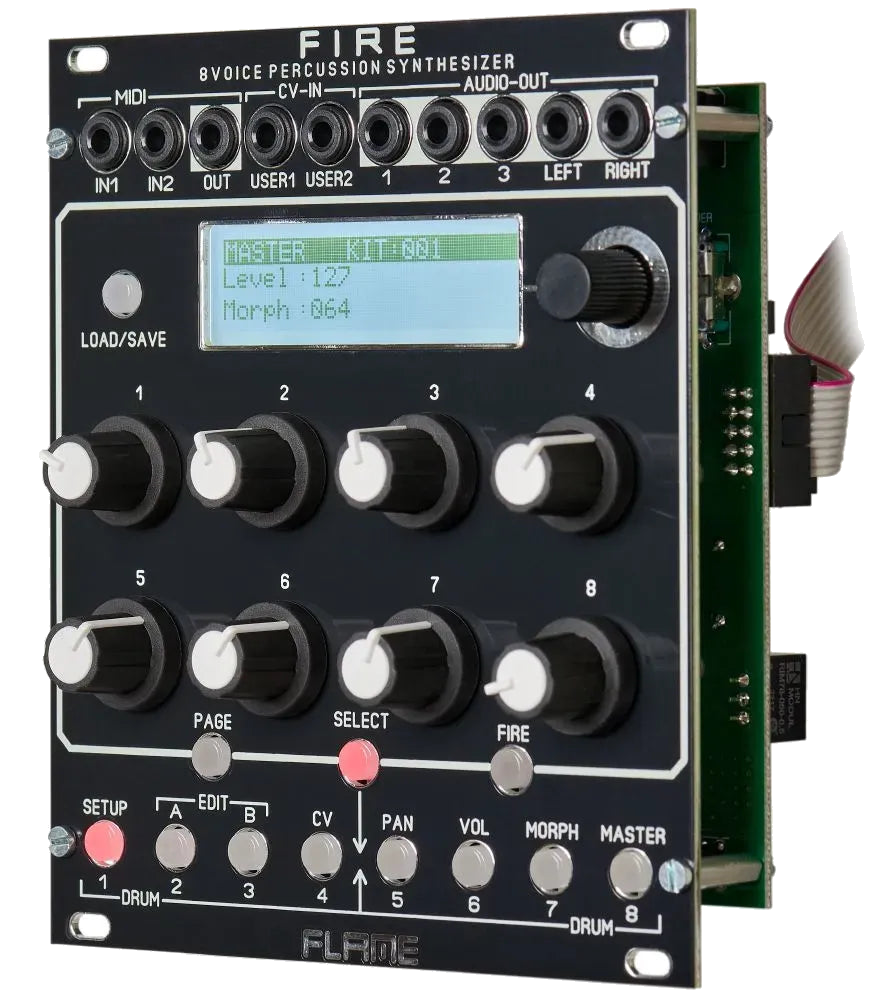 Fire stores up to 128 kits and 30 user presets per algorithm. Kits can be backed up, restored, or swapped via MIDI SysEx, and changes triggered with MIDI program change—ideal for sequencing from external hardware or DAWs.