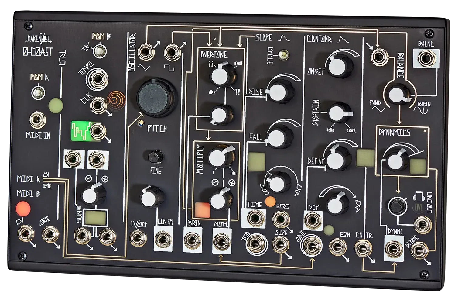 Inspired by Moog-style subtractive synthesis and Buchla-inspired waveshaping, the 0-Coast offers a unique, standalone system that doesn't require patching—but invites it. Its architecture includes a triangle-core oscillator shaped by Overtone and Multiply circuits, a four-stage envelope (Contour), a looping function generator (Slope), and a transistor-based lowpass gate (Dynamics). These elements make it easy to create anything from smooth, organic tones to aggressive, modulated textures.