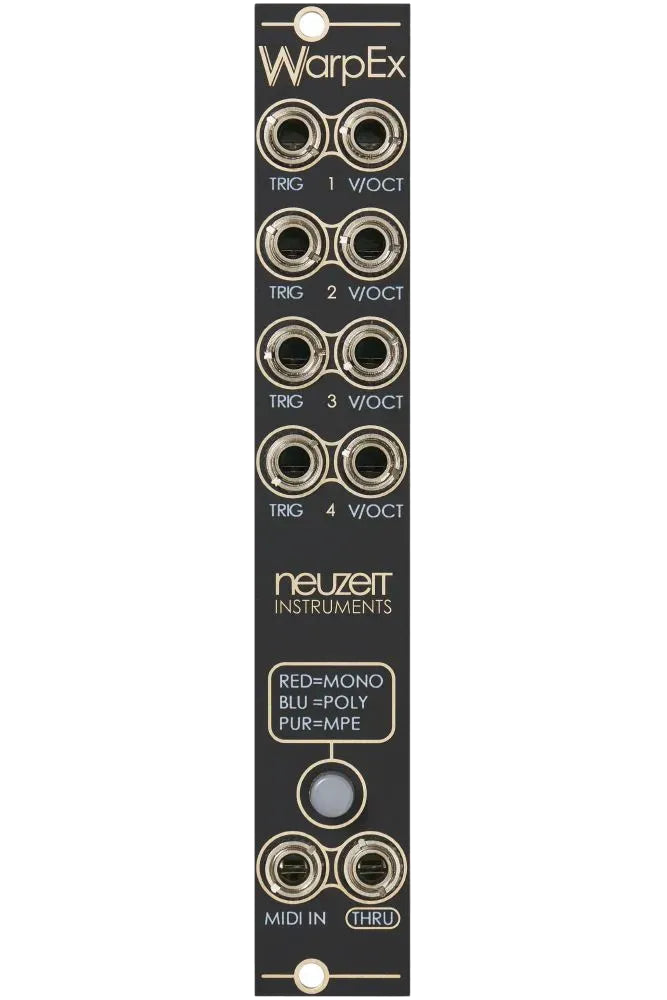 With Gate + CV control for each voice, WarpEx opens up extensive possibilities for polyphonic sequencing and live performance. Each voice can be tuned separately using individual pitch control voltages, which is perfect for multi-track sequencers and sophisticated setups. For users who prefer MIDI or MPE, the module integrates seamlessly with external controllers, offering expressive control over each note via separate MIDI channels. Pitch bend, aftertouch, and key tilt can each be individually mapped within Warp's modulation matrix, adding dynamic control over timbre, vibrato, and volume.