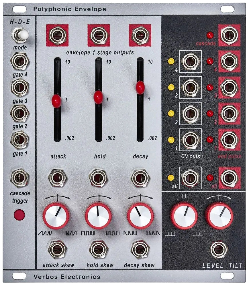 The Verbos Polyphonic Envelope is a powerful and flexible AHD envelope generator, purpose-built for the evolving world of polyphonic modular synthesis. True to the Verbos design ethos, it goes far beyond traditional envelope generators with cascading logic, skew control, and deep modulation possibilities.