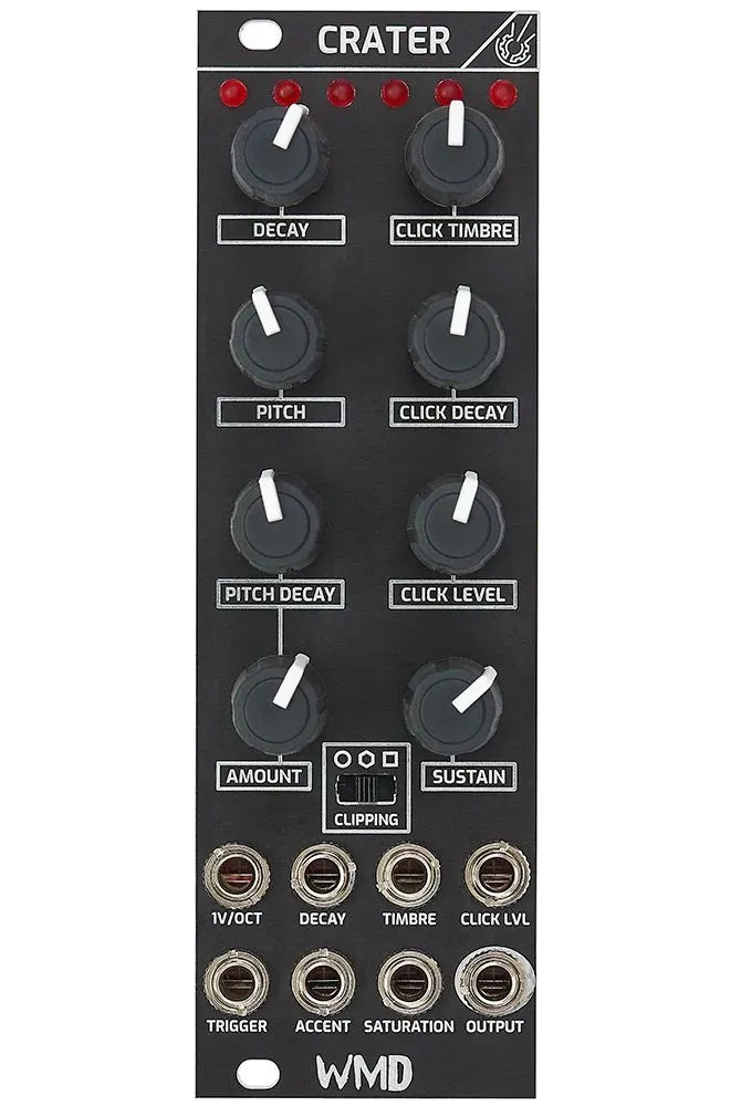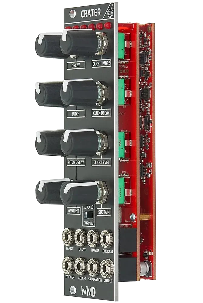 The Crater by WMD is a hybrid bass drum module that fuses analog warmth with digital flexibility to deliver earth-shaking low end and sculptable character. Designed to hit hard and sit well in a mix, Crater brings the punch of classic drum machines into the modular world — with modern control and tonal versatility.