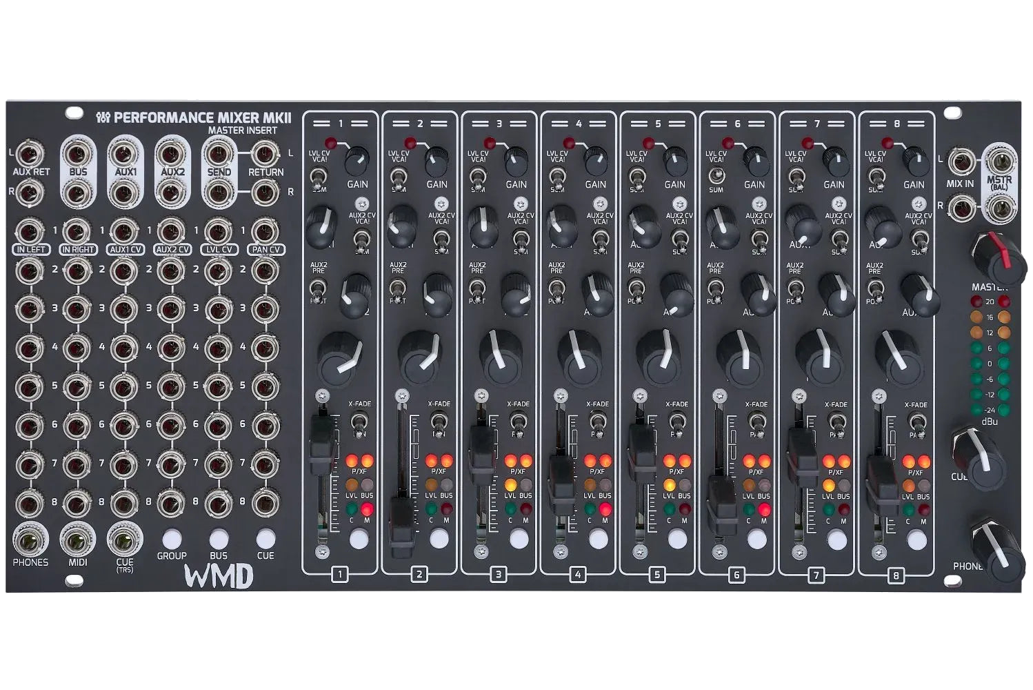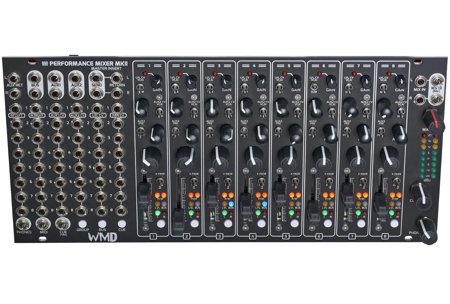 The WMD Performance Mixer MKII is a powerful stereo mixing solution designed specifically for live modular systems. Building on the success of the original, MKII adds dual mono/stereo channel support, stereo AUX paths, cleaner circuitry, and a dramatically improved patching layout—perfect for fast, performance-ready workflows.